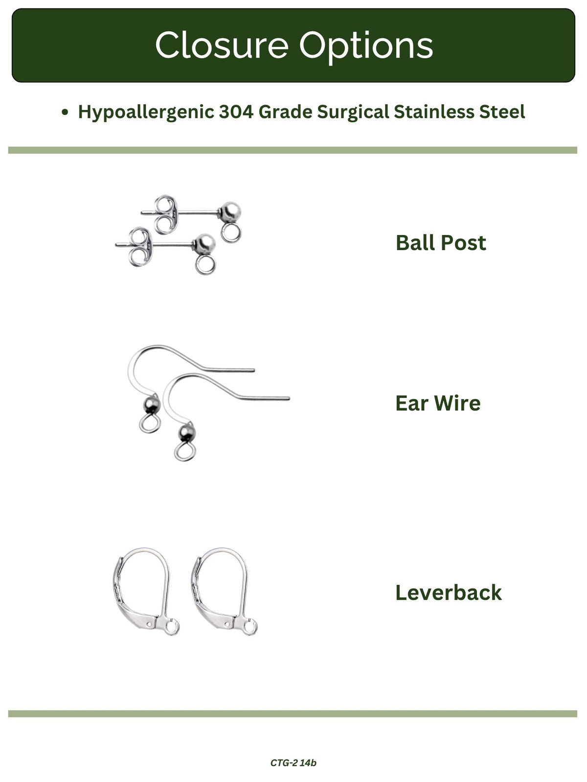 All closures are made of 304 surgical stainless steel. Available as ball post, ear wire, or leverback.